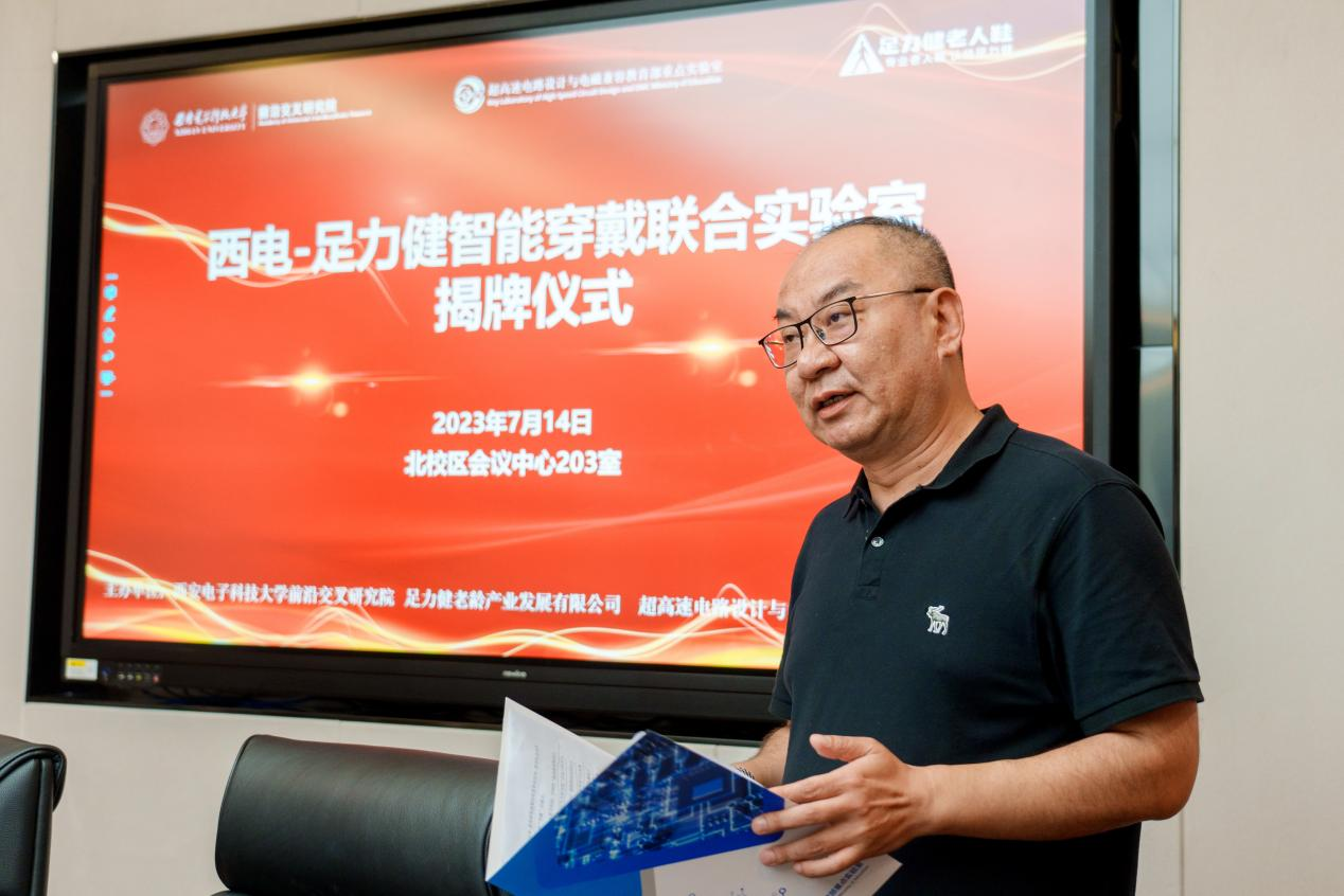 7月14日,西安电子科技大学-足力健智能穿戴联合实验室揭牌仪式圆满完成。西安电子科技大学科研院科技成果管理处处长沈满,西电-足力健智能穿戴联合实验室主任杨刚、项目主管马国荣,足力健老龄产业发展有限公司负责人等出席了揭牌仪式。“智能穿戴联合实验室”的成立,将以推进智能穿戴发展,研发新技术为初衷,积极落实“智能老人鞋”项目,通过校企合作的方式,将先进智能技术运用于老人智能穿戴设备,实现科研成果的转化和应用。